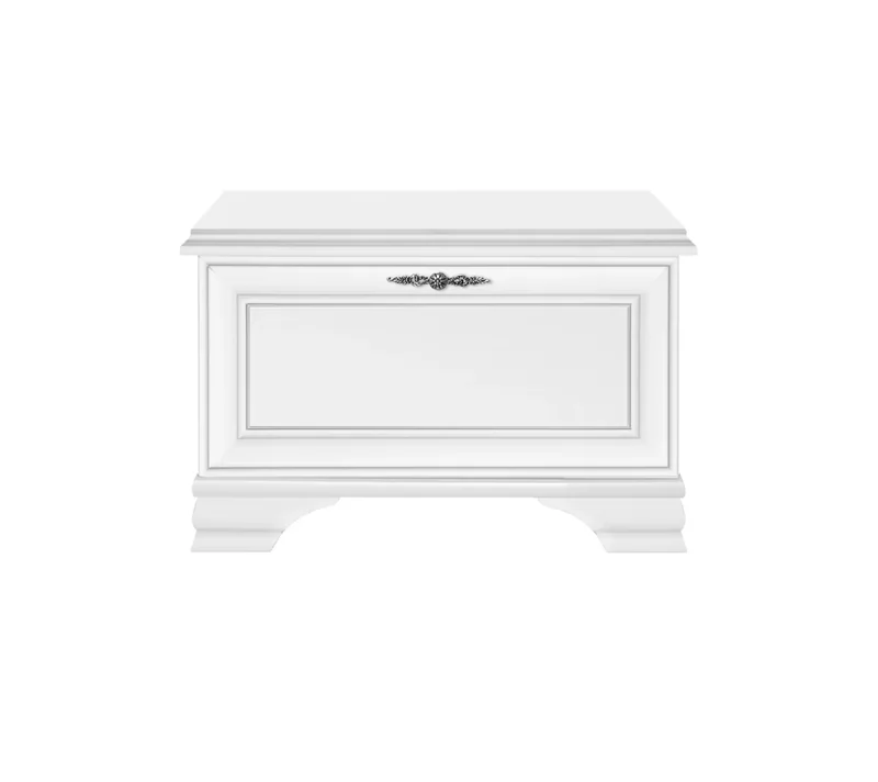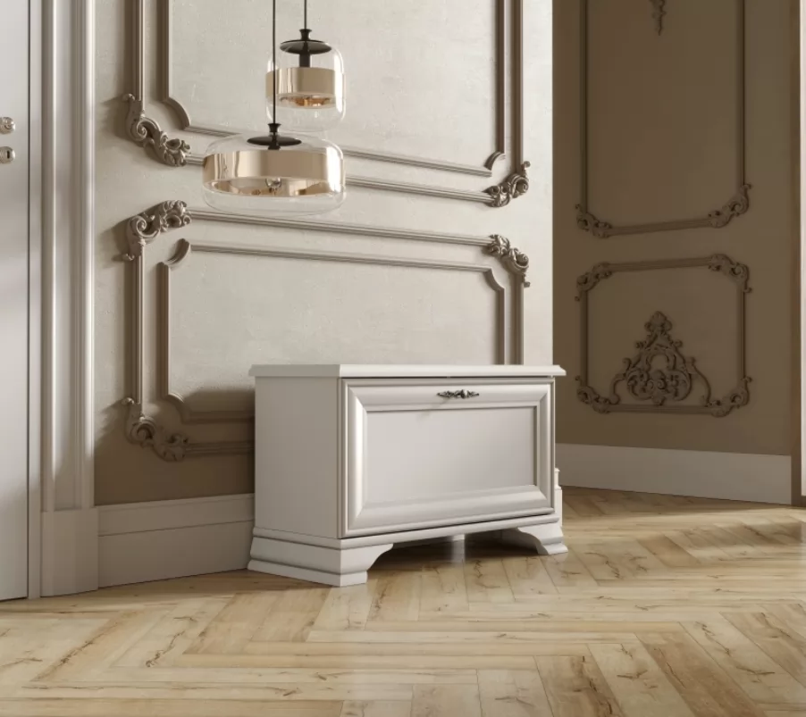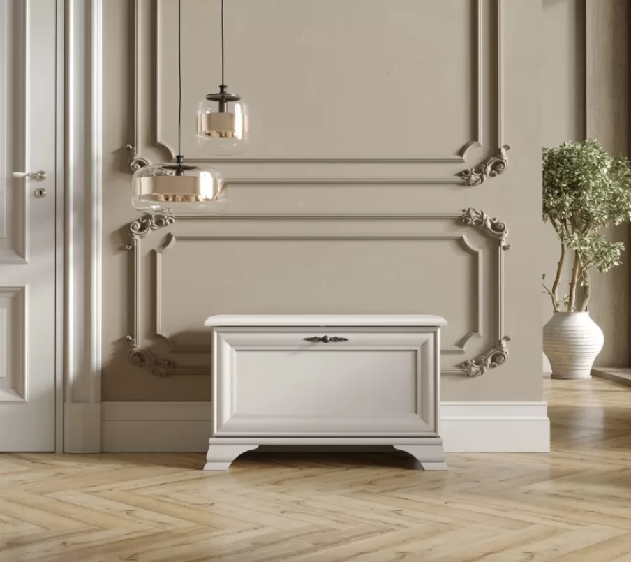 Изящная металлическая ручка удобна в использовании и подчеркивает классический стиль. Верхняя поверхность может служить подставкой для сумок, рюкзаков и ключей.