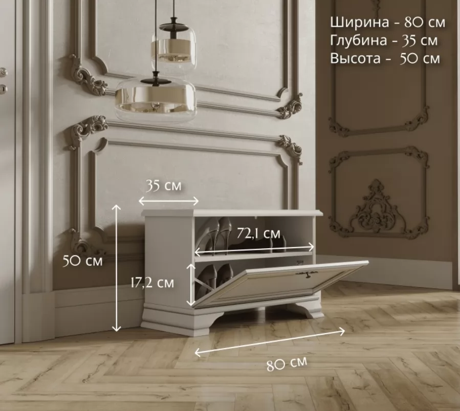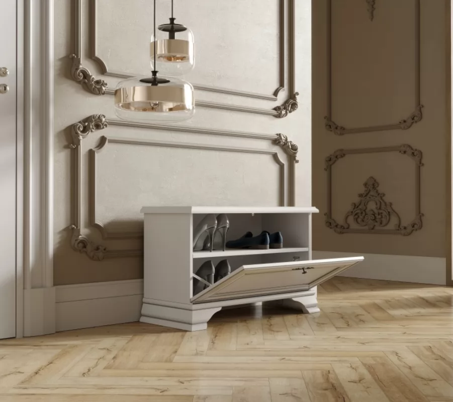 Модель имеет откидную дверцу и занимает минимум пространства при открытии. Это особенно актуально в небольших прихожих. Внутри имеется просторное отделение для хранения обуви и аксессуаров. Закрытая конструкция обувницы защищает вашу обувь от пыли и других внешних факторов.