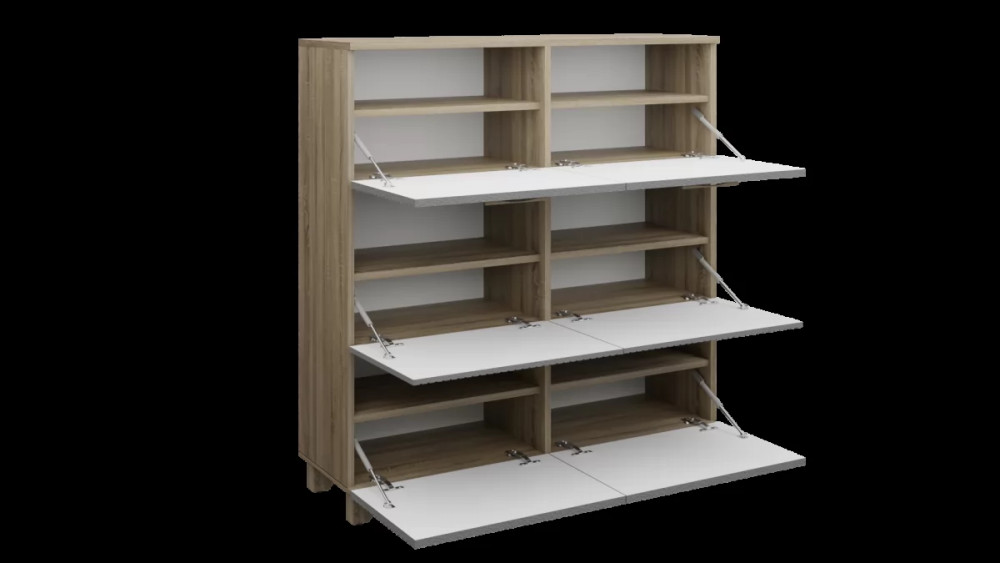 Вместительная обувница Копенгаген — это функциональное решение для прихожей. Модель оборудована шестью откидными ящиками для хранения большого количества обуви. Конструкцией предусмотрены петли с доводчиками для плавности хода створок. Ручки из натурального массива дуба добавят удобства в использовании обувницы. Опоры изделия изготовлены из массива дерева и регулируются по высоте, что позволяет нивелировать неровности поверхности. Возможно сочетание цветов фасада и корпуса.