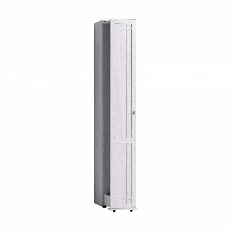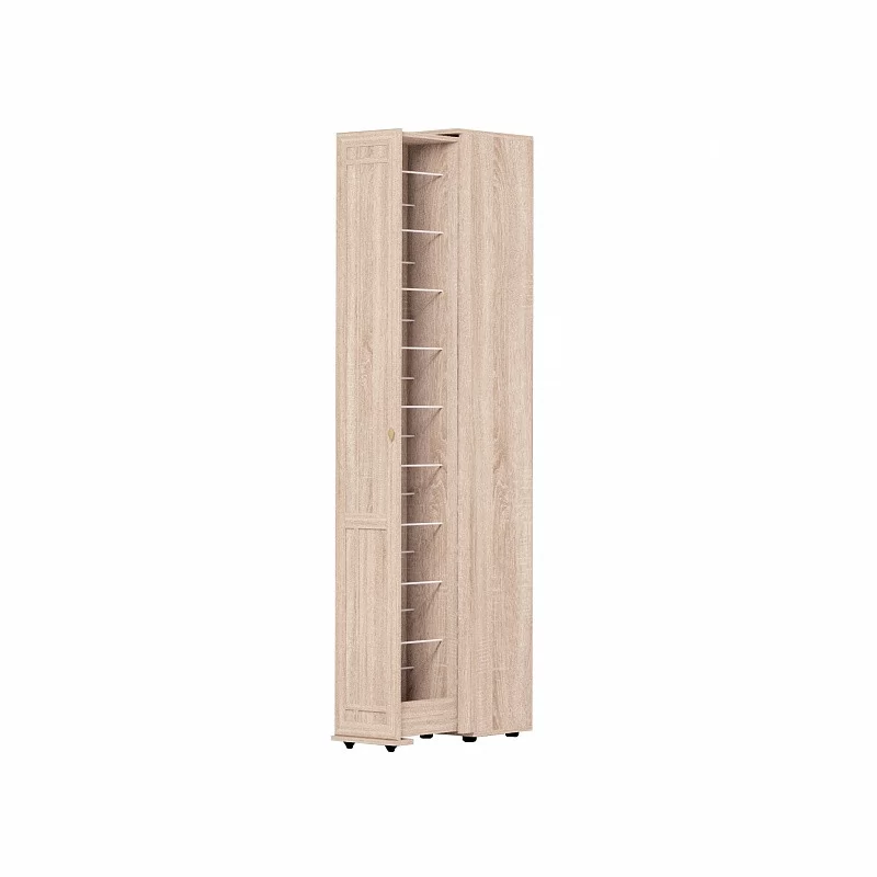 Высокая и узкая обувница - уникальное предложение на рынке мебели. Узкий (300 мм), но высокий (2125 мм) он вмещает до 18 пар обуви, а также средства по уходу за ней. Предусмотрены варианты перестановки стальных прутков-держателей для хранения маленькой детской обуви. Для этого в 2-х верхних и 2-х нижних рядах предусмотрена дополнительная присадка в центре для переноса стальных прутков ближе друг к другу. Шкаф выдвигается без усилий благодаря шариковым направляющим полного выдвижения и выкатным роликам.