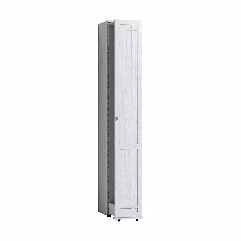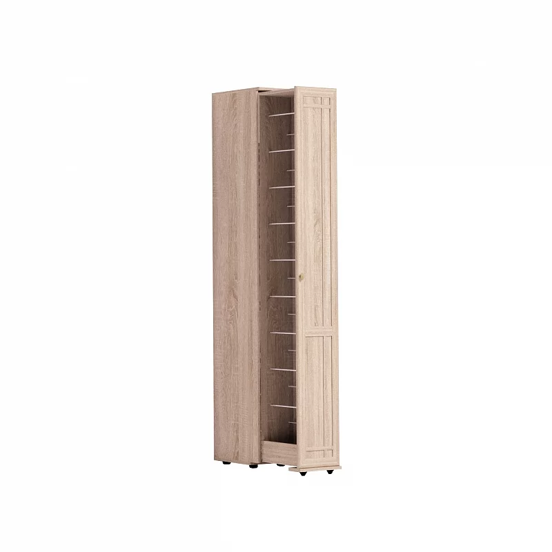 Высокая и узкая обувница - уникальное предложение на рынке мебели. Узкий (300 мм), но высокий (2125 мм) он вмещает до 18 пар обуви, а также средства по уходу за ней. Предусмотрены варианты перестановки стальных прутков-держателей для хранения маленькой детской обуви. Для этого в 2-х верхних и 2-х нижних рядах предусмотрена дополнительная присадка в центре для переноса стальных прутков ближе друг к другу. Шкаф выдвигается без усилий благодаря шариковым направляющим полного выдвижения и выкатным роликам.
