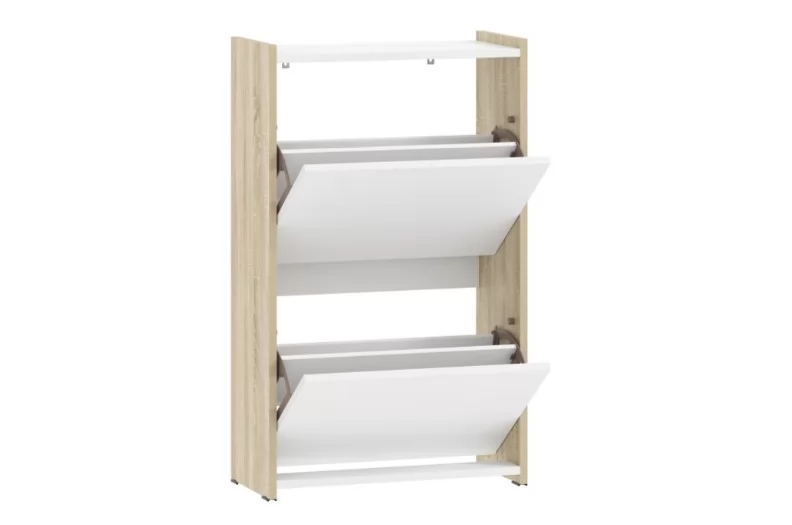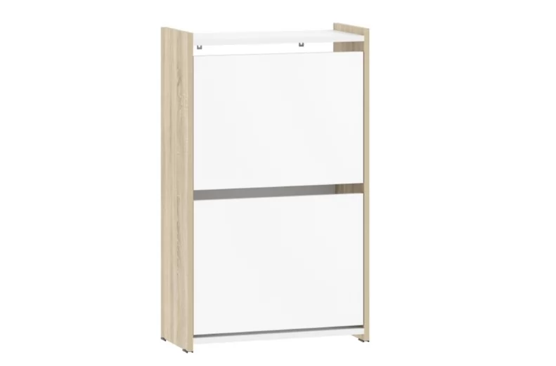 Тумба для обуви Симпл имеет стойкую конструкцию из 2-х закрытых секций с откидными полками, что позволяет хранить обувь сезонную и повседневную обувь и убережет ее от пыли.