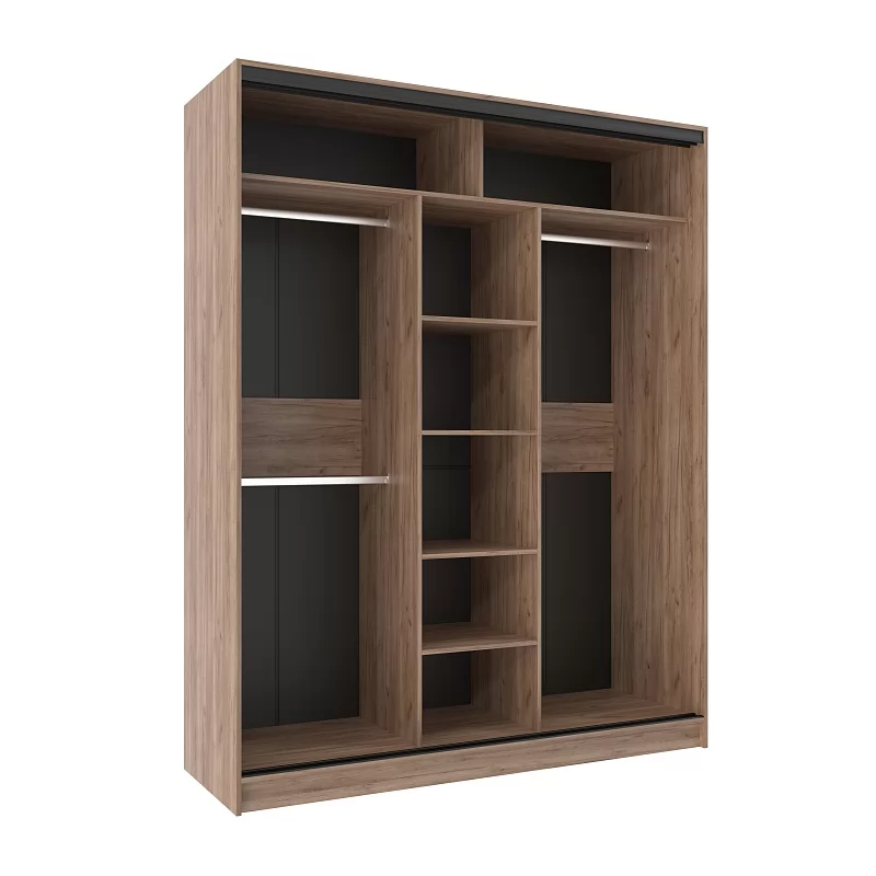 Шкаф-купе Домашний шириной 1800 мм подойдет для любой комнаты: спальни, гостиной, прихожей, детской. Продуманное внутреннее наполнение шкафа состоит из полок для белья и трех стационарных штанг длиной 635 мм. Разная высота крепления штанг позволяет держать в порядке короткие пиджаки, брюки и длинные вещи отдельно друг от друга. В изготовлении шкафа-купе Домашний использована система стальных профилей «Найди». Цвет системы подобран в цвет основного декора шкафа-купе. В комплектацию шкафа-купе Домашний входит шлегель - щётки с упругим ворсом, которые смягчают удары дверей при закрывании, а также защищают вещи от попадания пыли.
