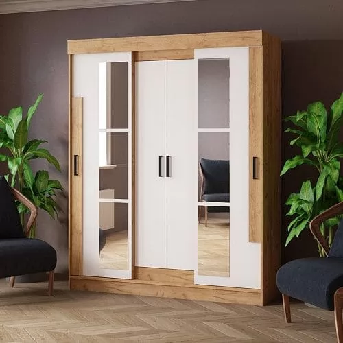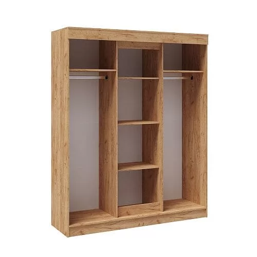 Фурнитура: опоры – подпятники пластиковые, черные. Ручки пластиковые, черные. Обработка краев зеркала – еврокромка. Внутреннее наполнение шкафов универсальное: по центру – отделение с полками, слева и справа стационарные металлические штанги.