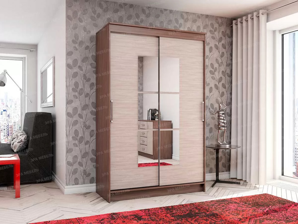 Данная модель шкафа-купе изготовлена из ЛДСП, соответствует следующим габаритам: высота – 2000 мм, глубина – 590 мм, ширина – 1260 мм.