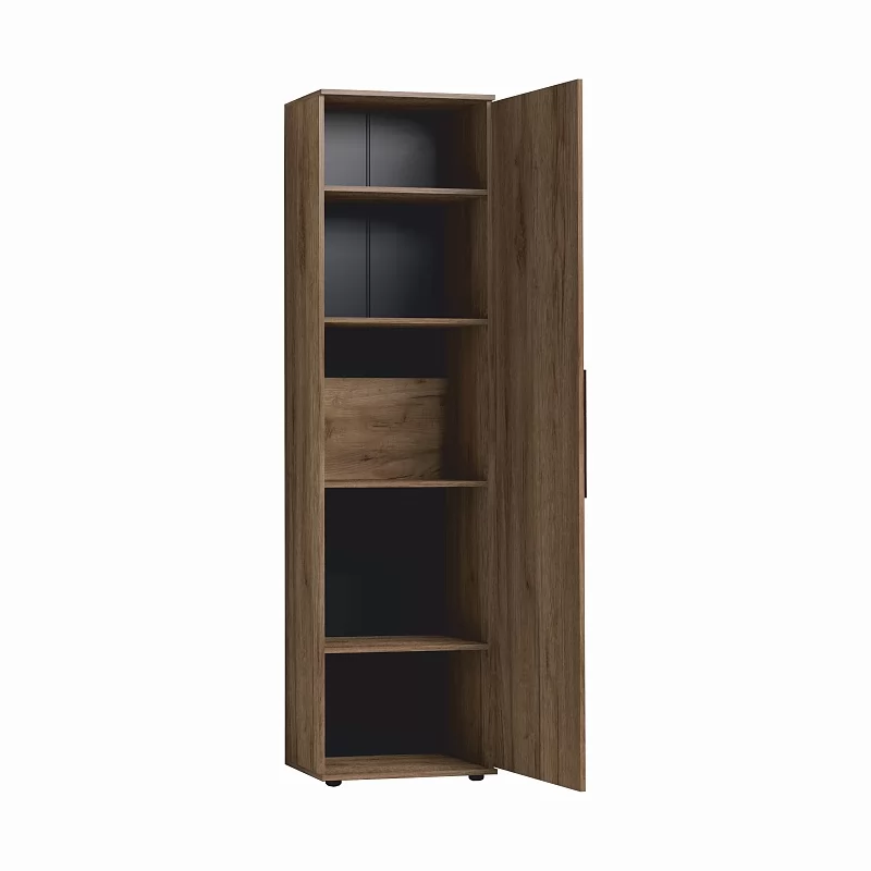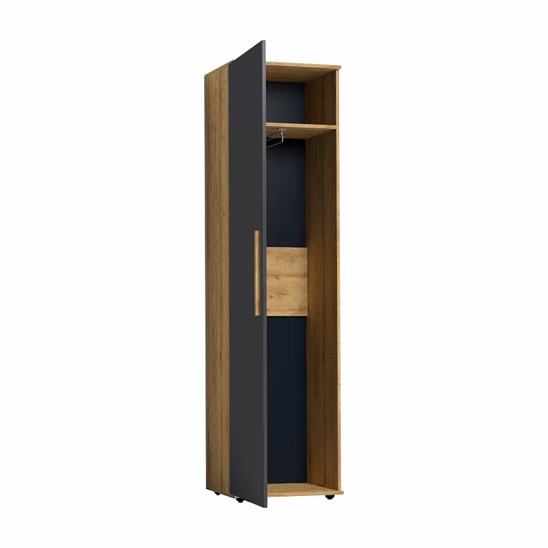 Распашной шкаф для одежды и белья комплектуется выдвижной штангой для одежды. При желании можно докупить и установить модуль CROWN 19 Полки (в комплекте 3 полки) тем самым изменив функционал шкафа. Фасад шкафа с трапециевидной ручкой из массива перенавешивается на правую и на левую сторону.