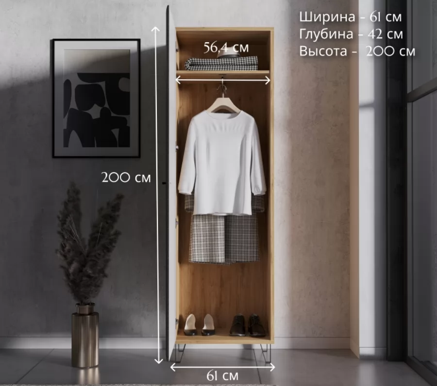 Лаконичный фасад и металлические ножки придают шифоньеру стильный и современный вид. Такая мебельная единица станет акцентным элементом в интерьере, подчеркивая его современный стиль.