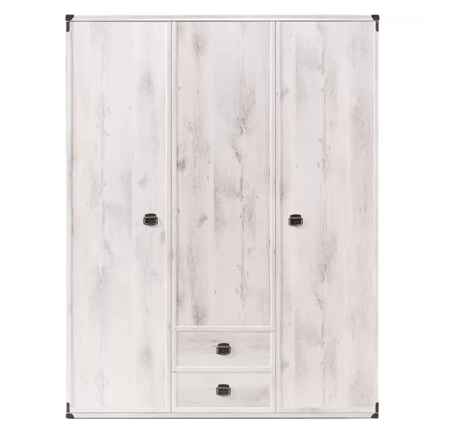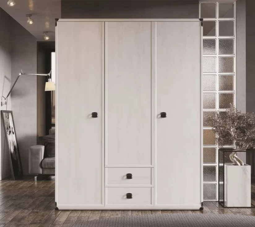 Шкаф выполнен в цвете «Сосна каньон», который воссоздаёт естественную текстуру древесины с мягкими золотистыми прожилками. Матовая поверхность фасадов из ЛДСП и МДФ устойчива к царапинам и сохраняет безупречный вид даже при активном использовании. Декоративные металлические ручки в виде скоб и угловые накладки добавляют нотку деревенского шарма, гармонично вписываясь в интерьеры в стиле кантри, классика или прованс.