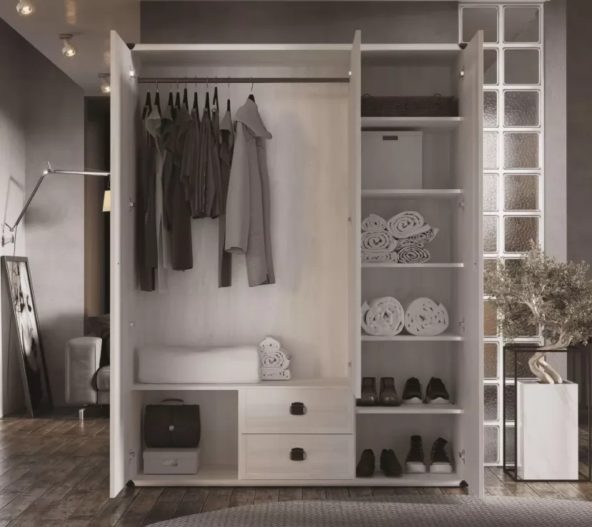 - Нижний блок: 2 выдвижных ящика на роликовых направляющих для мелких вещей или сезонных предметов.