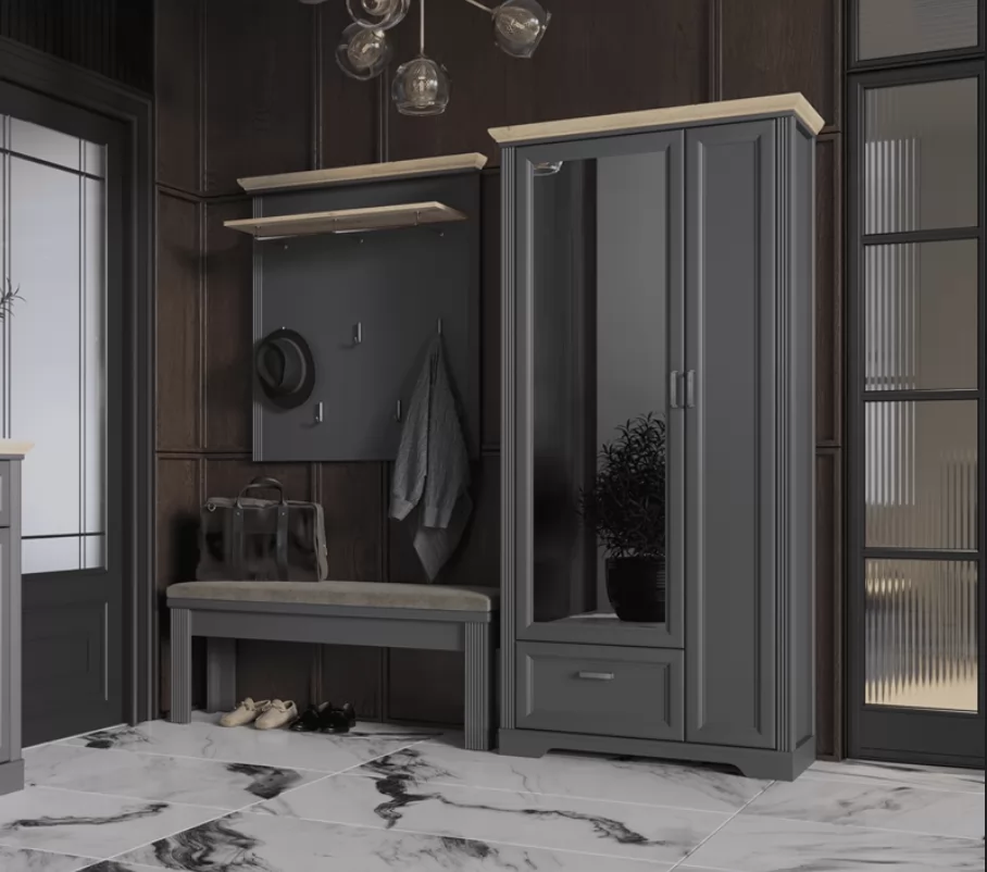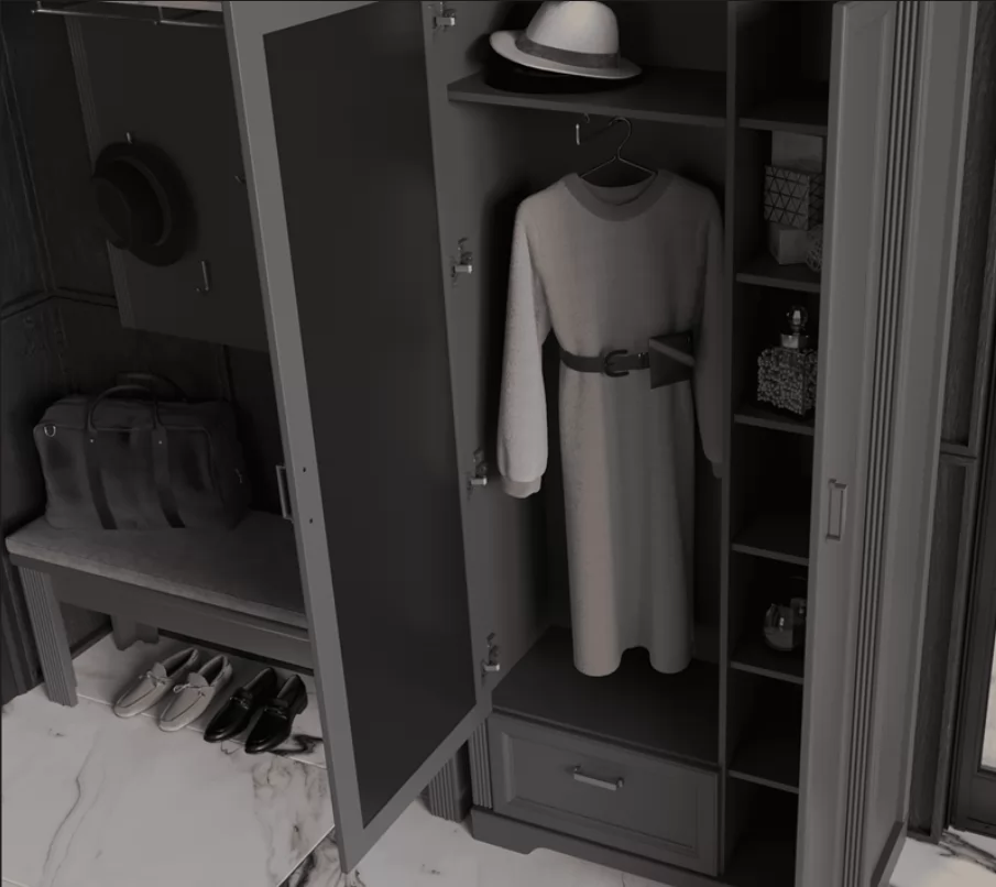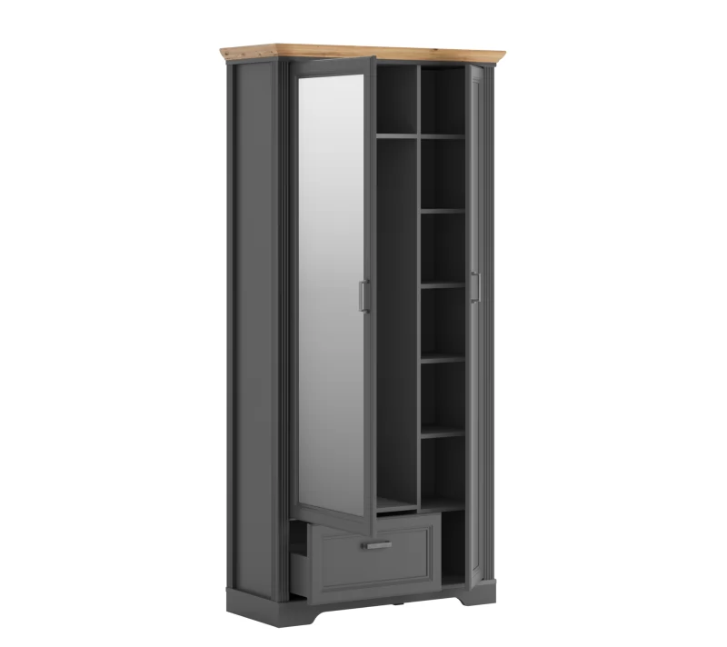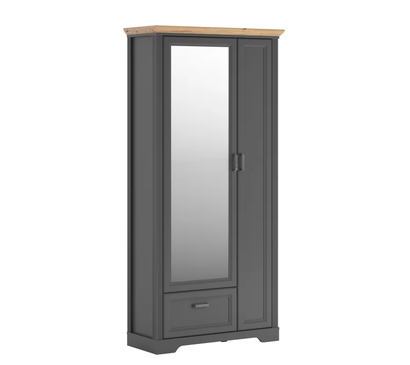 Шкаф имеет две распашные дверцы, одна из которых с зеркальной поверхностью. Вместительные полки и штанга внутри позволяют хранить вещи как горизонтально, так и вертикально. Выдвижной ящик оснащен шариковыми направляющими, что делает закрытие плавным и комфортным.