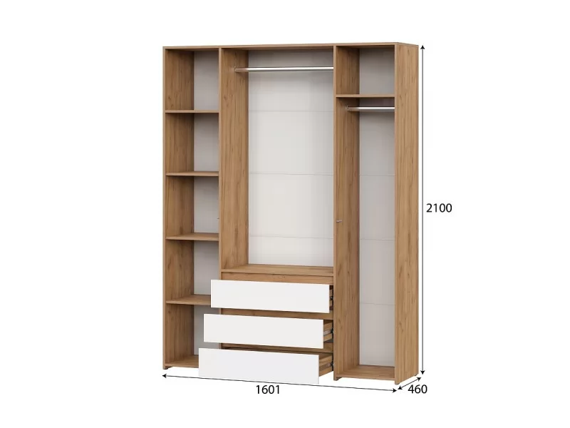 Створки навешиваются на беспружинные петли и открываются при помощи механизма push to open. Максимальная нагрузка на ящики - 5кг, на стационарные полки - 10кг.ШкафШирина изделия, мм: 1601Высота изделия, мм: 2100Глубина изделия, мм: 460