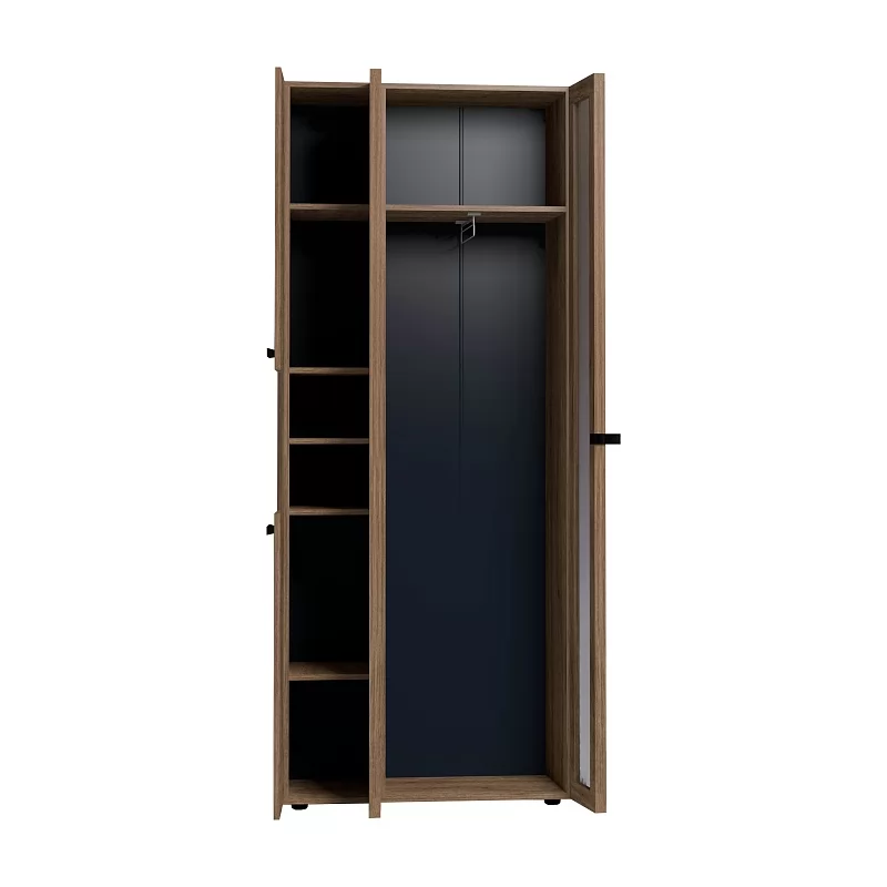 Nature 87 Шкаф для одежды и белья создаст все необходимые условия для хранения в прихожей верхней одежды и аксессуаров. В этом шкафу есть все необходимое для размещения верхней одежды: выдвижная штанга, верхняя полка, ряд регулируемых полок. Большая секция оснащена выдвижной штангой для развешивания пальто и курток на плечиках. Выдвижная штанга выдерживает вес до 10 кг. Один из зеркальных фасадов Контур открывается за ручку-петлю из черной экокожи, второй фасад - за раму.