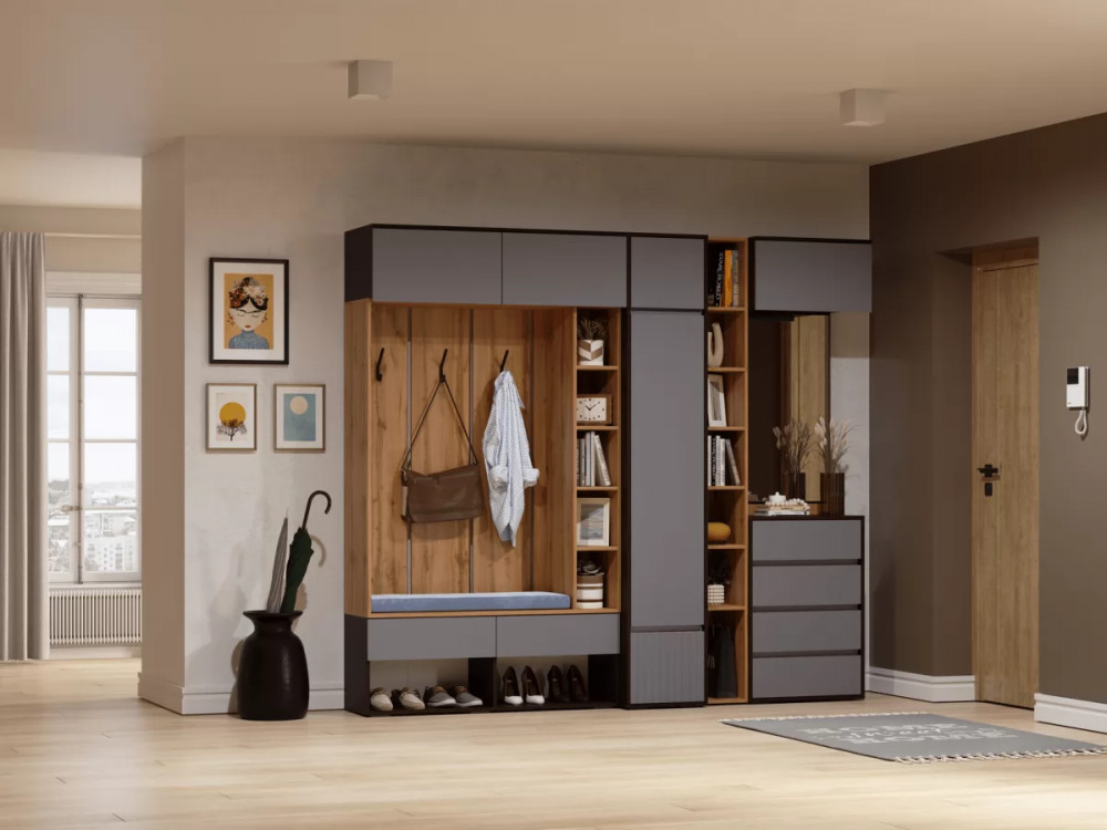 Прихожая – это обязательная составляющая любой квартиры или дома. Именно данное помещение создает первое впечатление о жильцах. Модульная прихожая «Прага» характеризуется в первую очередь функциональностью. Она достаточно вместительна для хранения различных вещей, обуви, одежды, сумок. Данное изделие выполнено в современном цветовом стиле, который отличается мобильностью, удобством и отличным функционалом. Вы можете собрать модульную прихожую под любое Ваше желание, если добавить антресоли общая высота прихожей составит 2,5 метра.