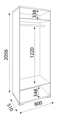 Шкаф имеет отделение со штангой для вещей на вешалках и 2 полки: съемную нижнюю и жесткую верхнюю.
