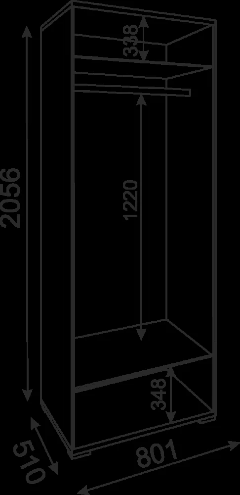 1. Шкаф имеет отделение со штангой для вещей на вешалках и 2 полки: съемную нижнюю и жесткую верхнюю.