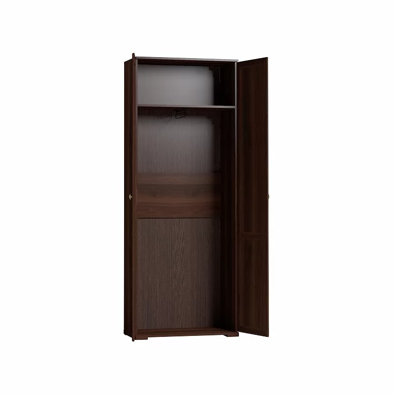 Распашной платяной шкаф с выдвижной штангой для одежды. Благодаря своей маленькой глубине (400 мм) разместится в небольшой по габаритам комнате, не заняв много места. На верхней полке можно хранить аксессуары и коробки с головными уборами.