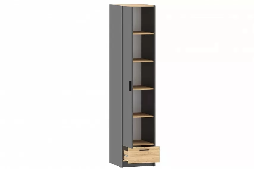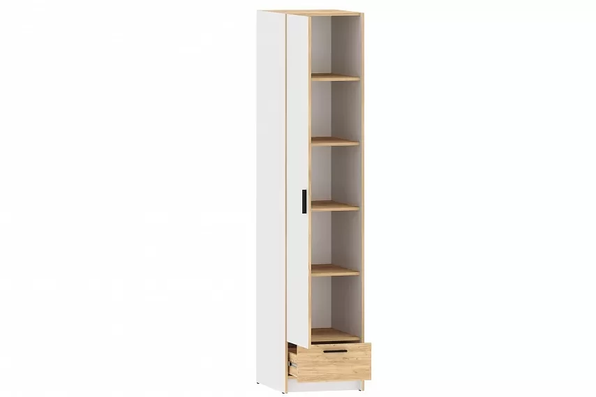 Шкаф оснащен пятью полками для хранения вещей, а также выдвижным ящиком с шариковыми направляющими, за счет которых ящик выдвигается плавно и бесшумно. Шкаф является модульным, что позволяет комбинировать его с другими шкафами из одноименной коллекции. Лаконичный дизайн шкафа гармонично подчеркивается черными ручками. Сборка шкафа универсальна – дверь может крепиться как на правую, так и на левую стороны.