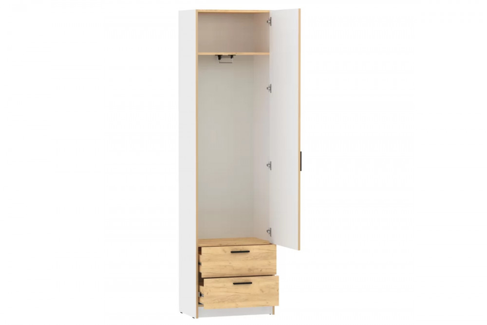 Шкаф оснащен полкой для хранения вещей, двумя выдвижными ящиками с шариковыми направляющими, за счет которых они выдвигаются плавно и бесшумно, а также выдвижной штангой, которая позволяет комфортно размещать предметы гардероба. Шкаф является модульным, что позволяет комбинировать его с другими шкафами и тумбами из одноименной коллекции. Лаконичный дизайн шкафа гармонично подчеркивается черными ручками.