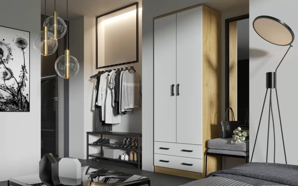 Шкаф укомплектован штангой для одежды и 2 ящиками для белья.