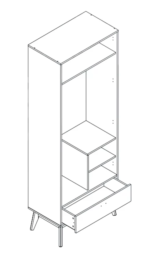 Шкаф с вкладными боками соединенные полкой, разделен на два отделения: верхнее закрыто двумя дверями, за которыми располагается штанга, внизу расположен ящик на шариковых направляющих.