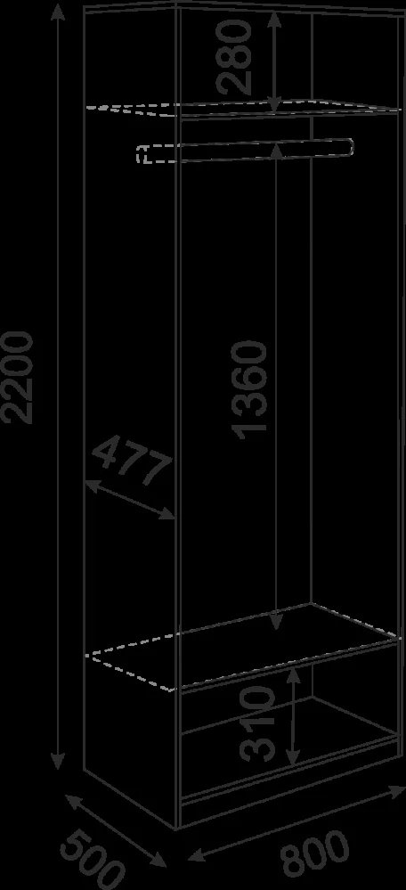 2. Шкаф имеет отделение со штангой для вещей на вешалках и 2 жесткие полки: нижнюю и верхнюю.