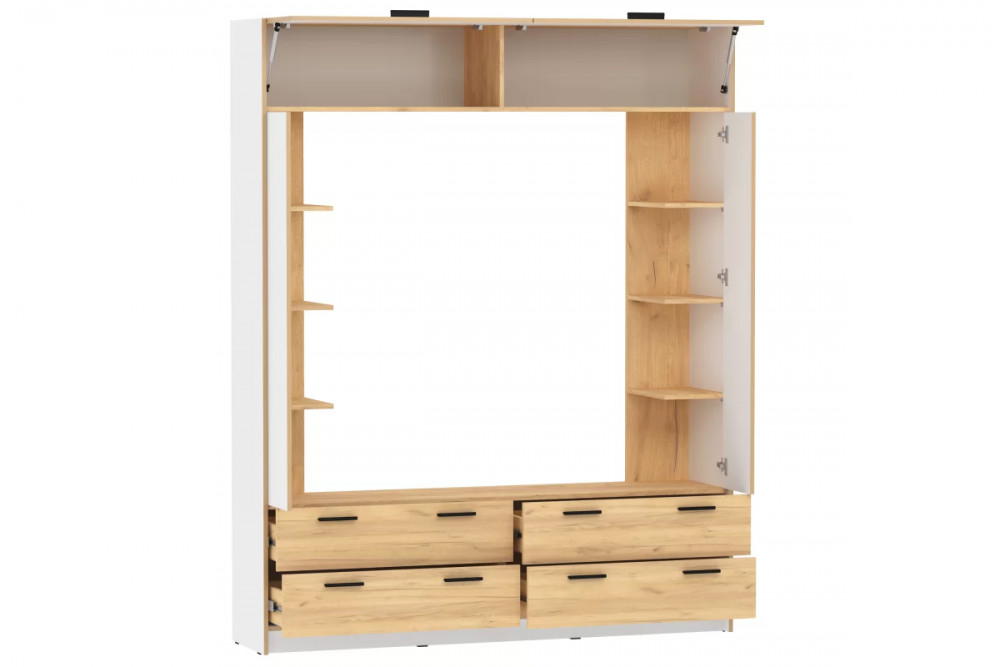 Шкафчики в верхней части стенки оснащены удобными дверками с открытием вверх. Скрытые полки за распашными дверками в средней части изделия придутся по вкусу любителям книг и интерьерных мелочей. Нижнюю часть стенки занимают четыре вместительных выдвижных ящика на шариковых направляющих, позволяющие аккуратно разместить вещи. Шкаф является модульным, что позволяет комбинировать его с другими шкафами и тумбами из одноименной коллекции. Лаконичный дизайн шкафа гармонично подчеркивается черными ручками.
