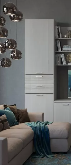 Шкафы, несмотря на небольшую глубину, вместительны. Фасадная часть - фрезерованная плита МДФ в пленке ПВХ. В серии используется ручка-скоба 96 мм (сатин светлый). Корпус - ЛДСП 16 мм. Шкафы комплектуются регулируемыми опорами L-20.