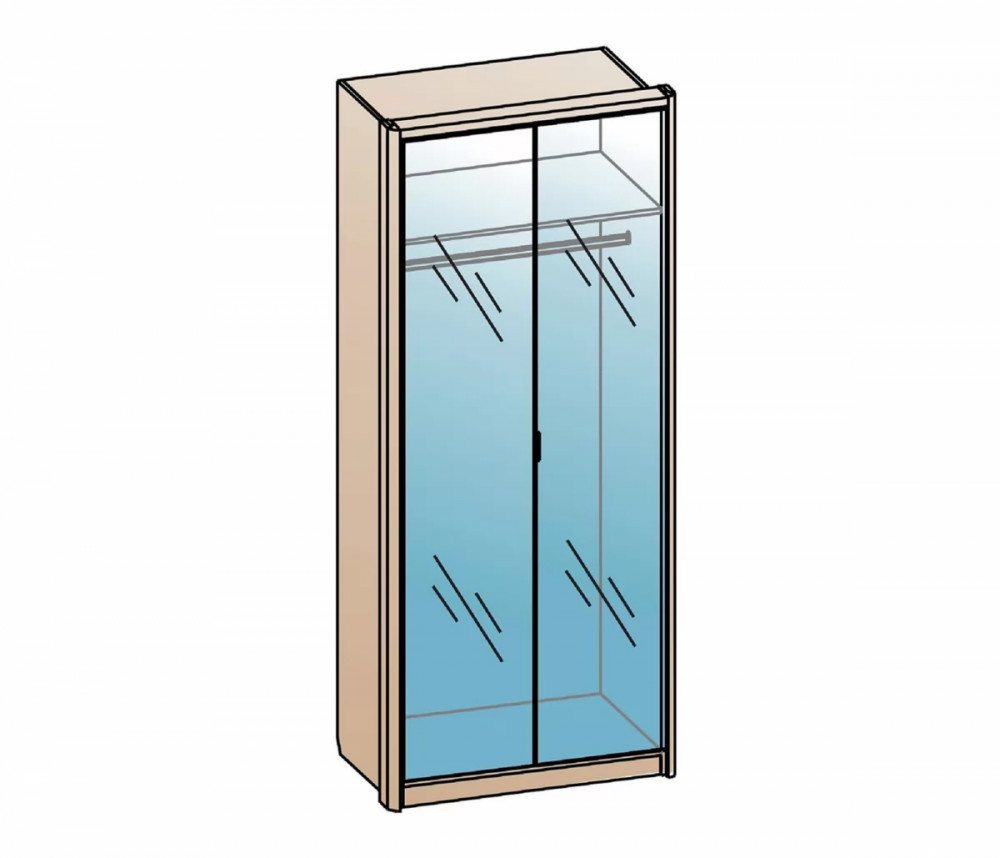 Фасады шкафов декорированы зеркалами с обработкой фацет. Высота шкафов составляет 2330 мм, а полезная глубина 568 мм. Шкафы изготовлены из материала ЛДСП 16 мм, задняя стенка из ХДФ.