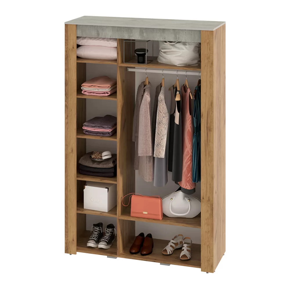 -наполнение изделия представляет собой отделение для одежды на плечиках и многочисленные полки для белья или трикотажа.