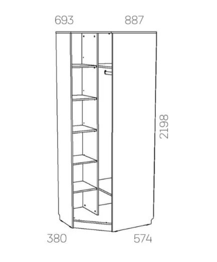 Со шкафом Оливия НМ 014.11 X получится максимально использовать пространство в комнате, задействовав место в углу. Внутри модуль разделен на две функциональные зоны. Секция с пятью полками подходит для хранения одежды в сложенном виде, а на штанге в другой половине шкафа можно разместить одежду на вешалках-плечиках. Две широкие полки, расположенные над и под штангой, удобны для хранения коробок.