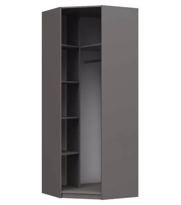 Угловой шкаф "Вива" - функциональный предмет мебели, оснащен стационарной штангой и множеством полок, идеально приспособленных для хранения большого количества разнообразной одежды и белья.