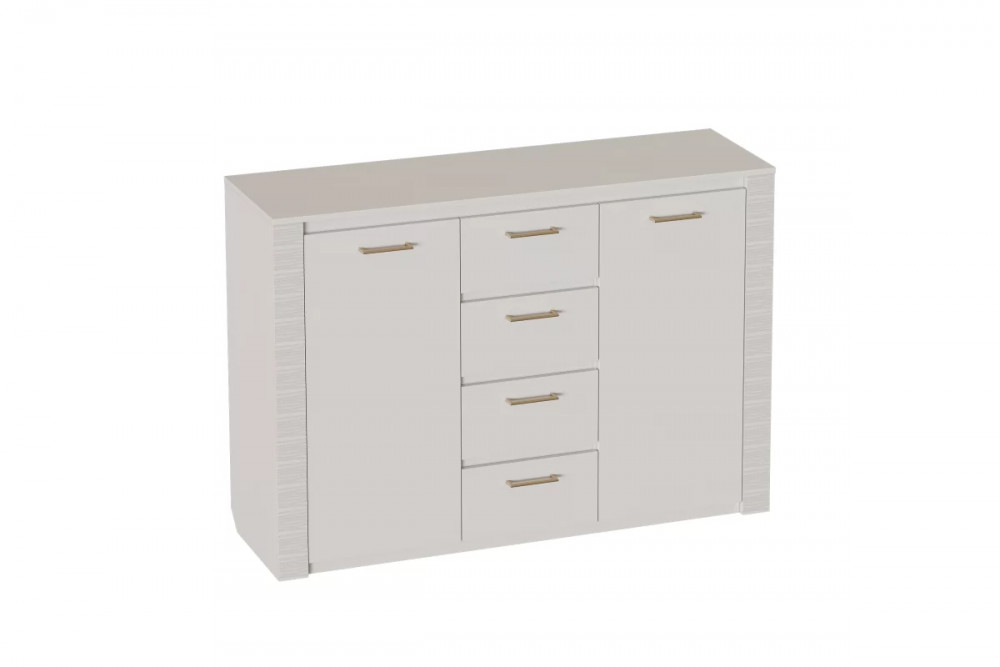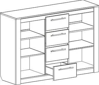 Комод оснащен четырьмя выдвижными ящиками на роликовых направляющих и двумя вместительными отделениями за распашными дверцами.