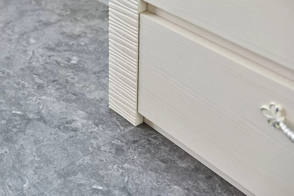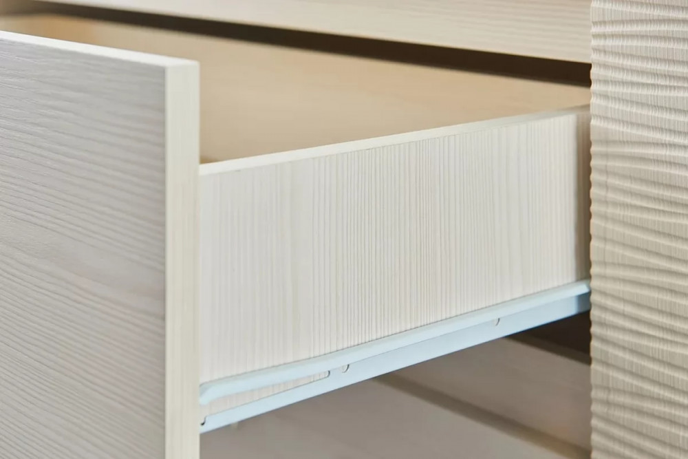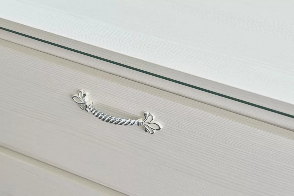 Комод оснащен четырьмя выдвижными ящиками на роликовых направляющих. Под столешницей имеется стеклянная панель (5 мм), предназначенная для установки светильника. Комплект подсветки (светильник и блок питания) приобретается отдельно. Блок питания рассчитан на подключение шести светильников.