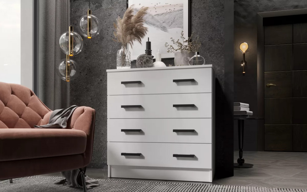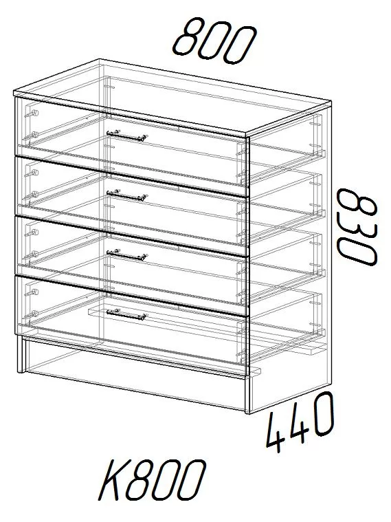 Комод К800 – удобное и утончённое решение для обстановки спальни. Мебель выполнена из надёжного материала – ЛДСП. Товар соответствует таким габаритам: высота – 830 мм, глубина – 440 мм, ширина – 800 мм. Состоит из 4 выдвижных ящиков, внутри которых много места для одежды и других принадлежностей. На поверхности конструкции также есть возможность хранить декор для дома.