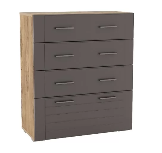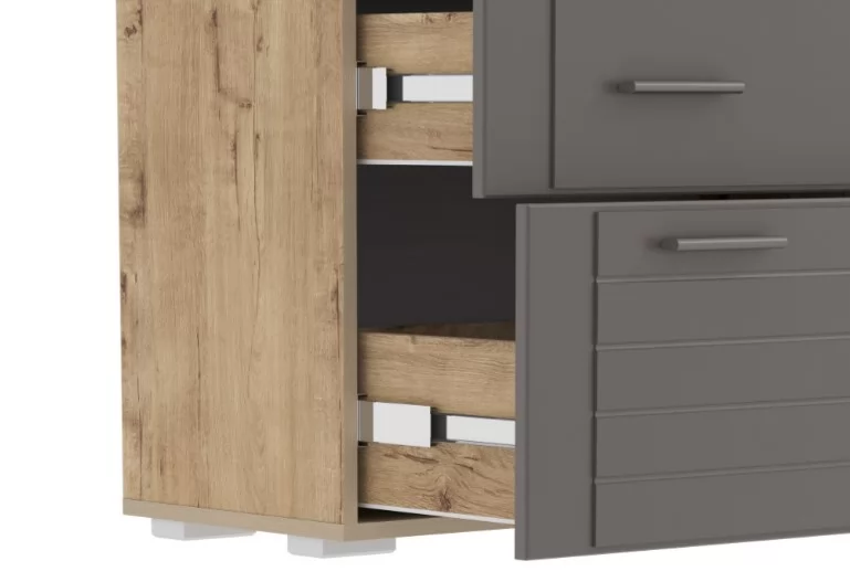 Комод Livorno НМ 040.46 идеально впишется в интерьер современной гостиной или спальни. Модуль оснащен четырьмя вместительными ящиками, плавный ход которых обеспечивают шариковые направляющие полного выдвижения. Верхние ящики меньше нижнего, поэтому подходят для хранения более легких вещей. На фасадах предусмотрено по две ручки, что обеспечивает максимально удобное открывание ящиков.