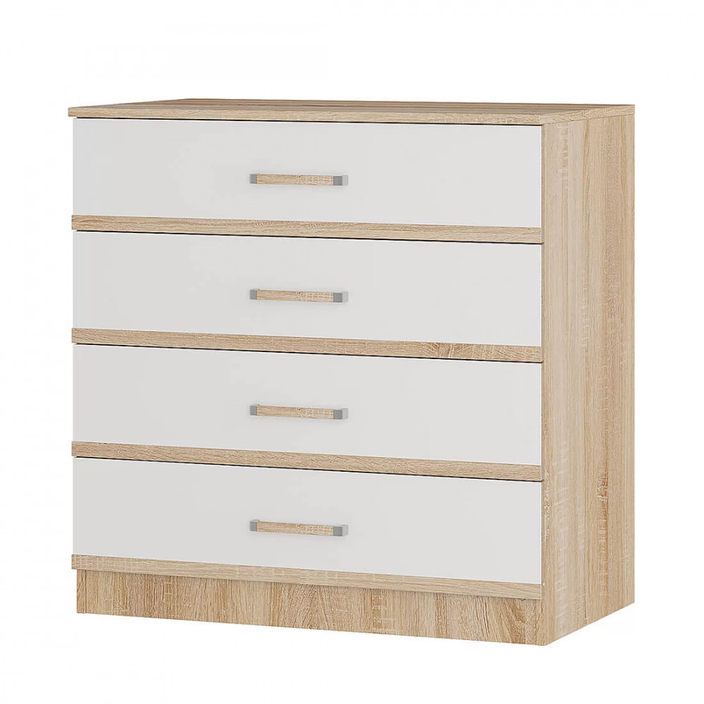 Его можно поставить как в прихожую, так и в спальню, детскую или гостиную. Классический комод Сакура состоит из четырех выдвижных ящиков, каждый из которых имеет светлый фасад и эргономичную ручку с хромированной отделкой. Корпус модели сделан из ЛДСП в цвете сонома.