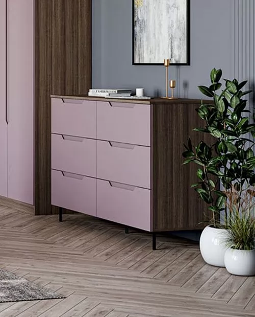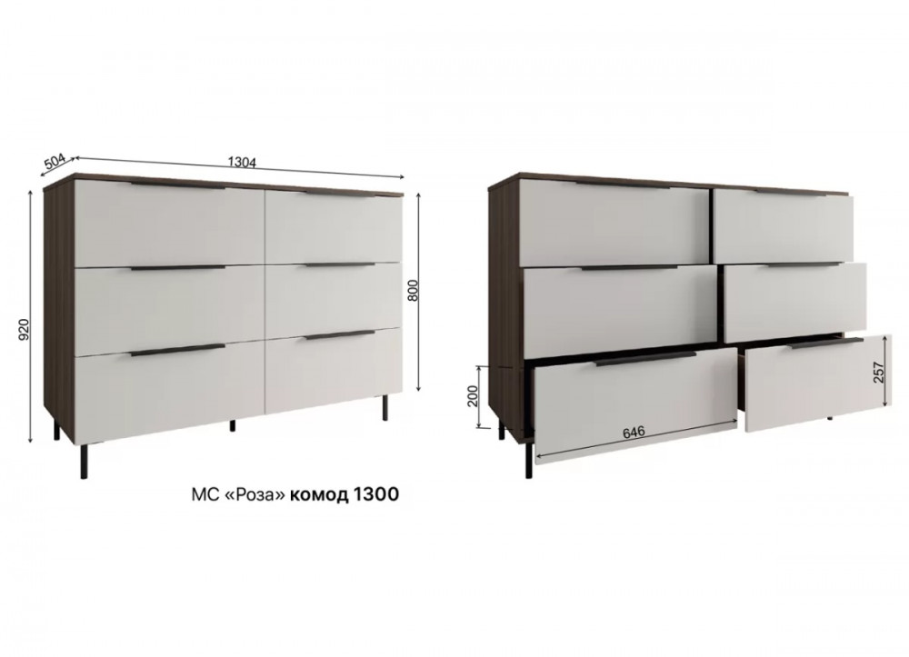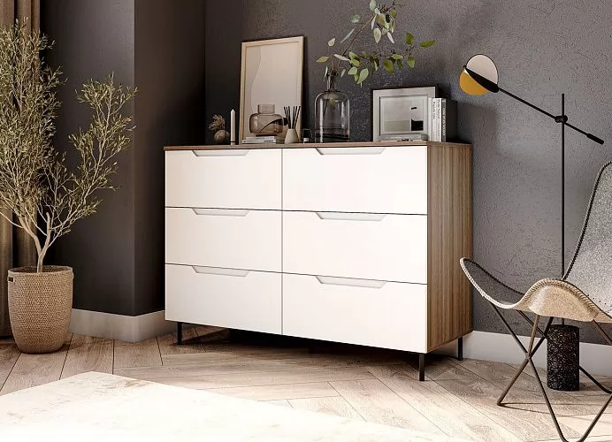 Комод имеет шесть выдвижных ящиков, которые обеспечивают достаточно места для хранения различных вещей. Фасады ящиков выполнены из МДФ, что обеспечивает прочность и долговечность. Фурнитура скрытого монтажа с доводчиками гарантирует плавное закрывание ящиков, что предотвращает повреждение фурнитуры и сохраняет их внешний вид на долгое время. Металлические ножки высотой 12 см. в количестве пяти штук обеспечивают равномерную нагрузку на поверхность пола и дополнительную устойчивость.