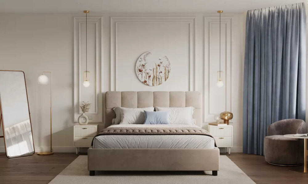 Современная кровать Голди в стиле минимализм с декоративной строчкой на изголовье может быть стилизована в скандинавский стиль спальни или современную классику, благодаря лаконичному дизайну изголовья. Высокое изголовье кровати позволит Вам создать органичный комплект с высокими комфортными матрасами. Мягкие царги и углы у изножья уберегут от травм. Высота опор облегчает уборку: под кровать легко заезжает робот-пылесос. Конструкция кровати очень прочная и надежная, благодаря использованию качественных материалов. Кроме этого, кровать укомплектована стальной рамой по всему периметру основания и усиленными ножками диаметром 50 мм.