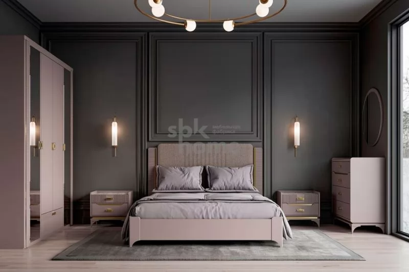 Кровать дополнена мягкой спинкой, выполнена в однотонной ткани рогожка.