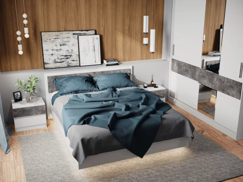 Современная модульная спальня с "парящей" кроватью, которая не оставит вас равнодушными. Удобный каркас кровати, большой вместительный шкаф-купе с новым каркасом, лаконичные тумбы и небольшой комод создадут неповторимый уют в вашей спальной комнате.