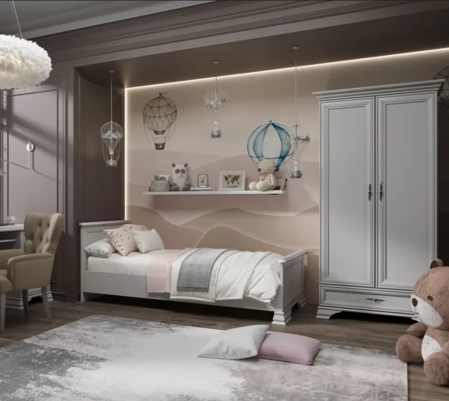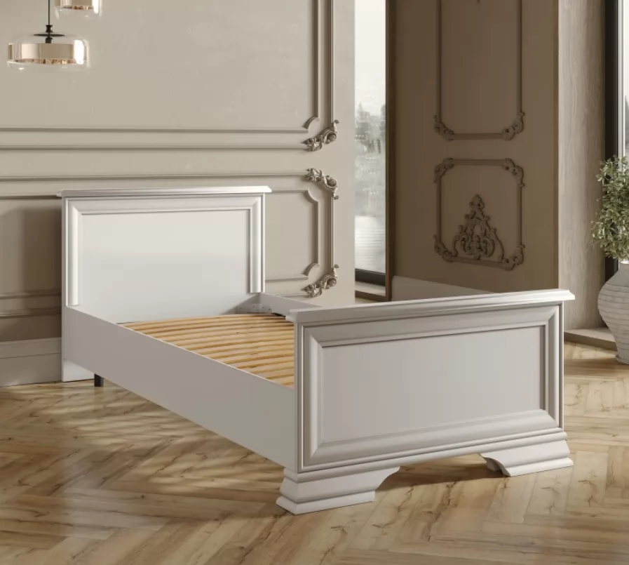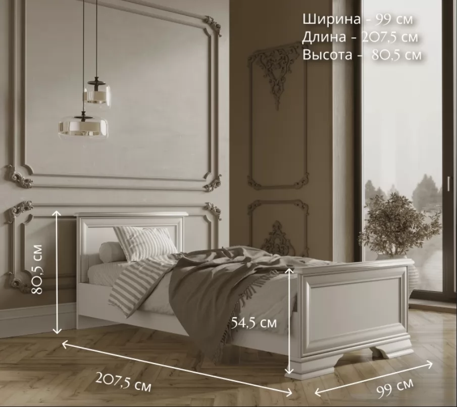 Изголовье и изножье кровати украшены планкой из МДФ, что подчеркивает классический стиль. Компактные размеры кровати делают ее идеальным выбором для небольших спален.