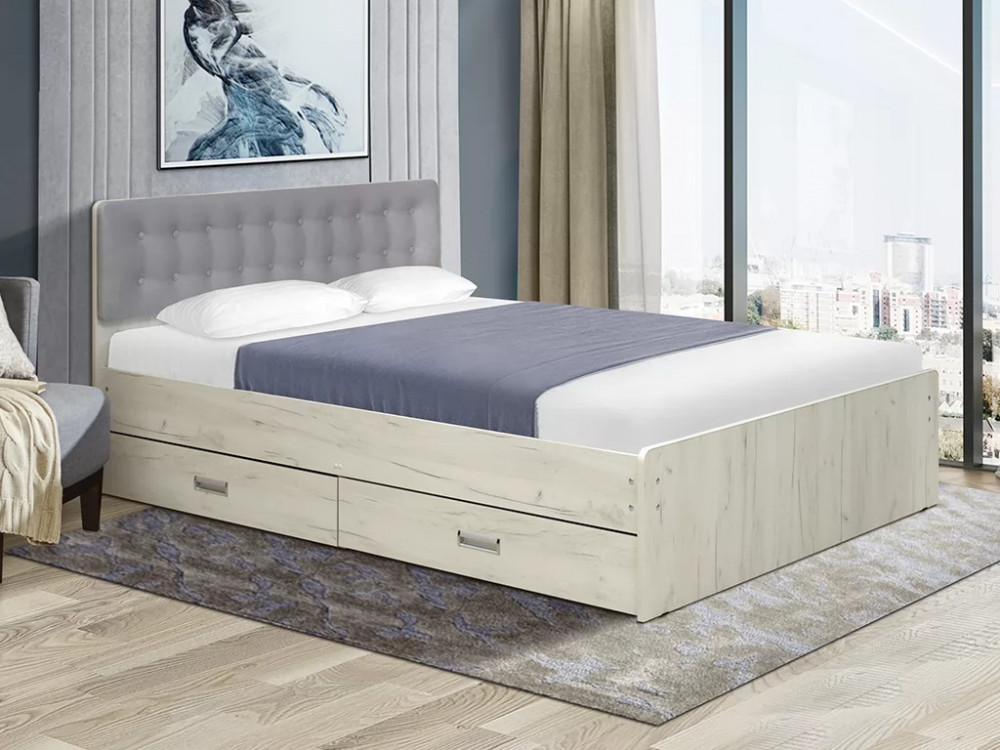 Кровать двойная №6 с ящиками и мягкой головной спинкой 1200х1900 мм дуб крафт белый/велюр 321 в Тюмени