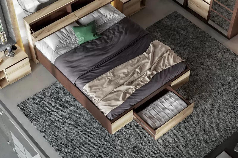 Подиумная система опоры кровати создает парящий эффект и придает грациозности интерьеру. Массивное изголовье оборудовано двумя скрытыми ящикам с откидными створками для хранения необходимых в зоне сна предметов. Нижний щеток кровати в своей центральной части имеет крупногабаритный выкатной ящик с усиленным дном.