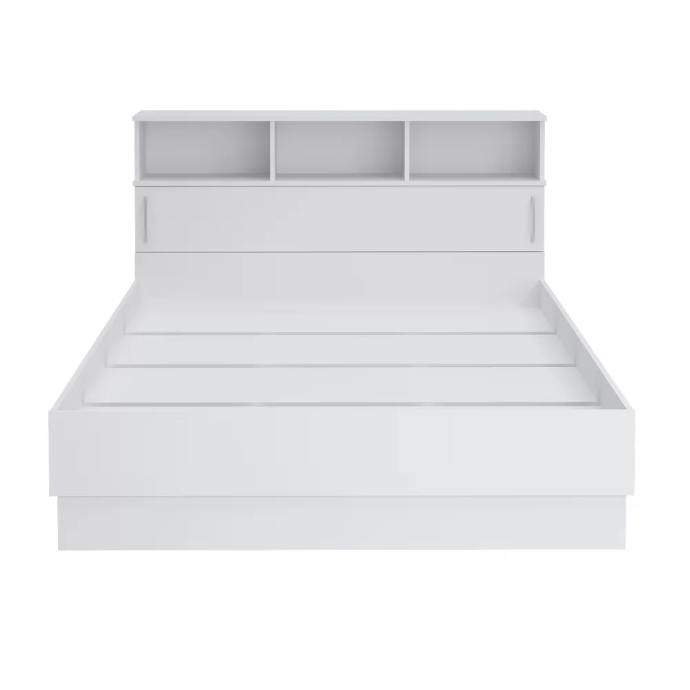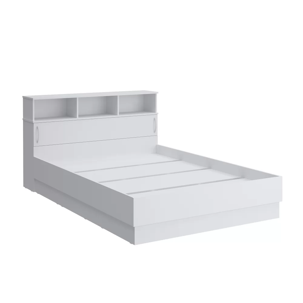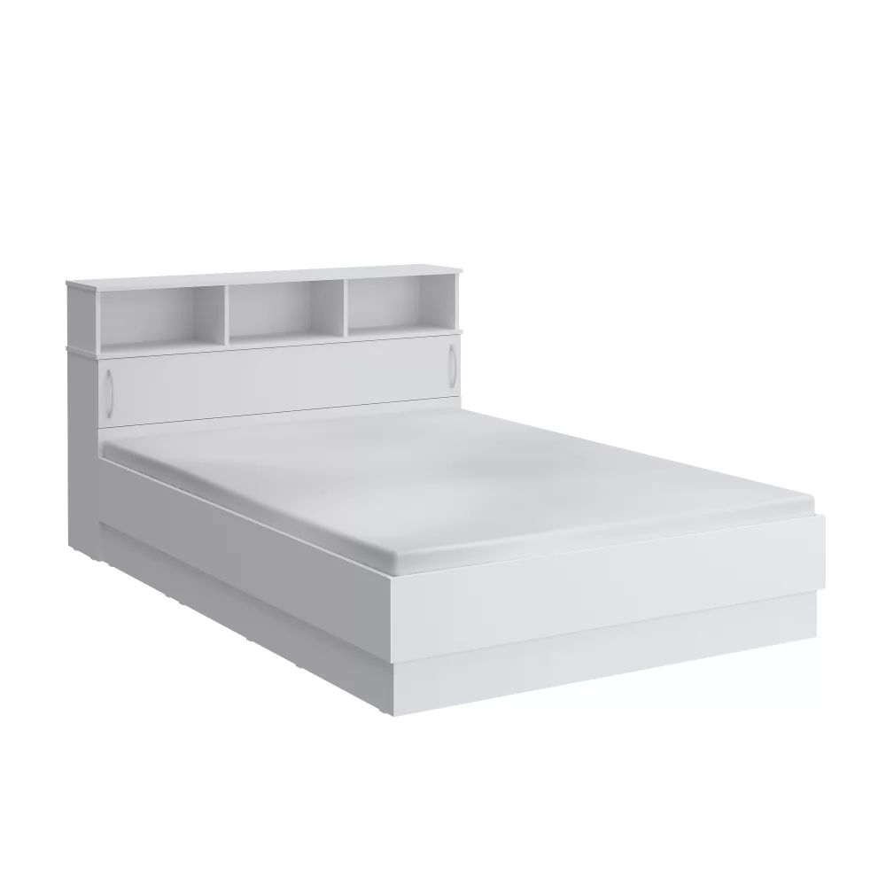 Практичная кровать с полочками в изголовье - открытыми для декора и потайными за дверкой для постельного белья.
