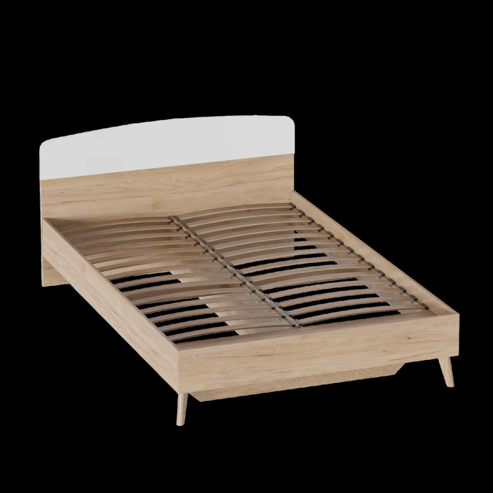 Кровать со спинкой в изголовье с накладкой из МДФ. В изножье кровать стоит на опорах из массива березы. Спинки соединены между собой тремя царгами. Основанием матраца является березовые изогнутые ламели, закрепленные на царгах.