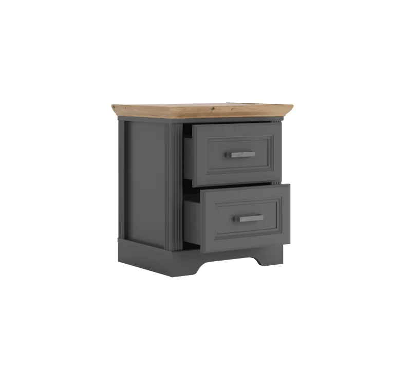 Тумбочка имеет два просторных выдвижных ящика для хранения необходимых вещей. Акцентная столешница предоставляет дополнительное место для размещения часов, цветов, фоторамок и других элементов декора. Ящики оснащены механизмом бесшумного закрытия.