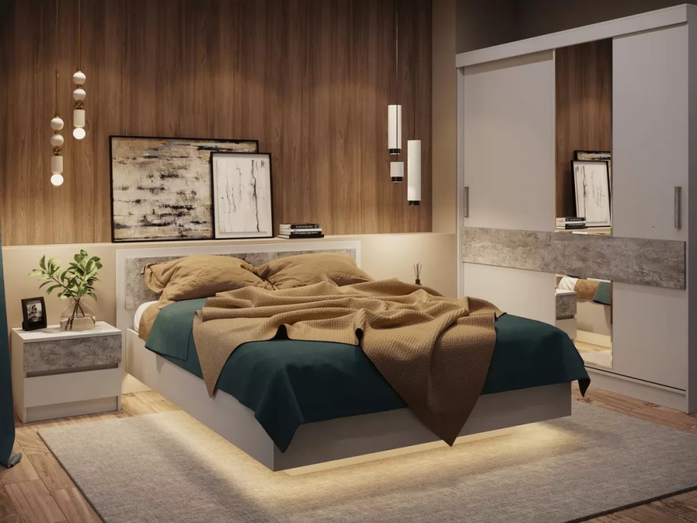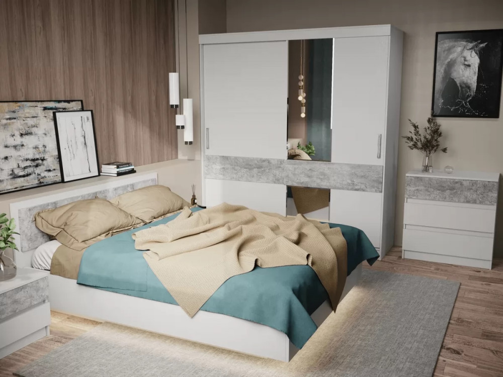 Современная модульная спальня с "парящей" кроватью, которая не оставит вас равнодушными. Удобный каркас кровати, большой вместительный шкаф-купе с новым каркасом, лаконичные тумбы и небольшой комод создадут неповторимый уют в вашей спальной комнате.