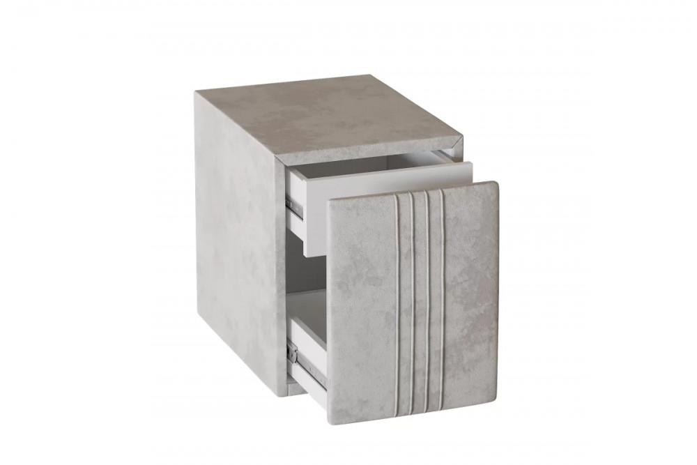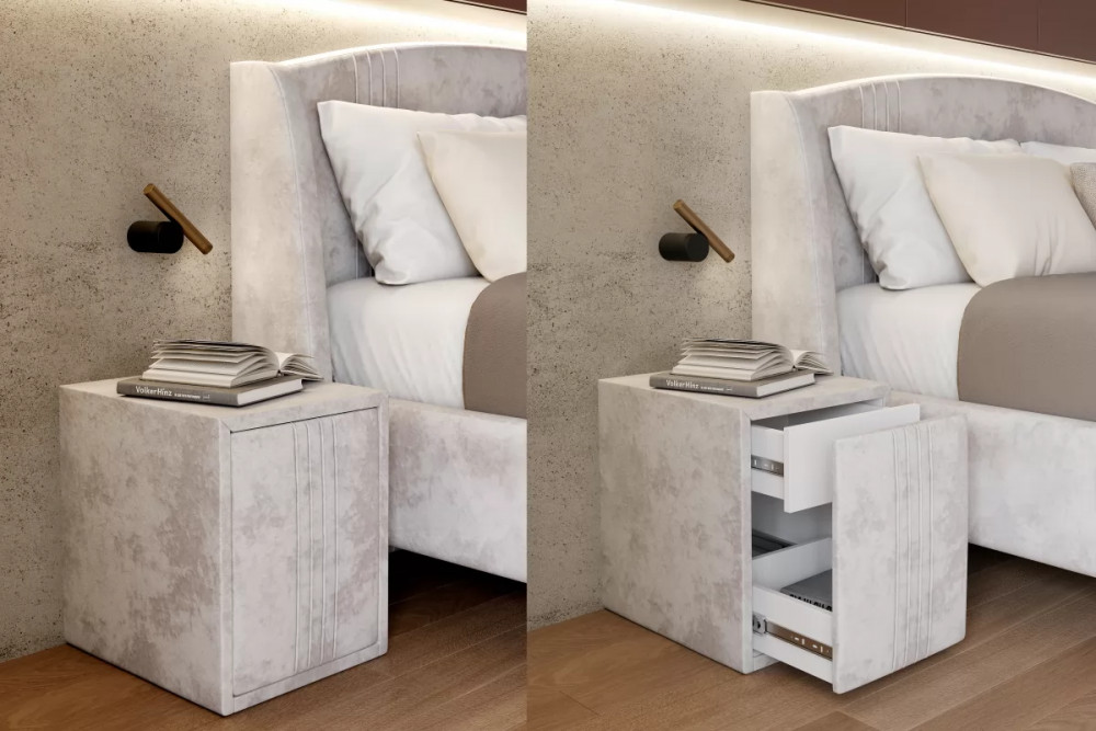 Тумба обтянута высококачественным велюром, имеет два вместительных выдвижных ящика с механизмом push to open. Скругленные торцы модели, минимизируют риск удариться в темноте.