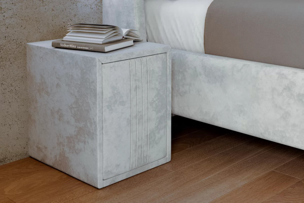 Тумба обтянута высококачественным велюром, имеет два вместительных выдвижных ящика с механизмом push to open. Скругленные торцы модели, минимизируют риск удариться в темноте.