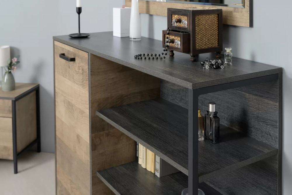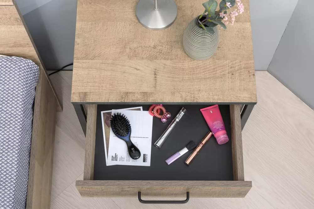 Брутальная спальня в стиле лофт. Кровать оснащена ортопедическим основанием с подъёмным механизмом, который открывает доступ к вместительному коробу для хранения. Металлические опоры делают эту мебель надёжной, аутентичной и функциональной. Лицевая фурнитура с тем же покрытием придаёт мебели индустриальную эстетику. Шкаф со створкой из тонированного стекла является современным и оригинальным решением.